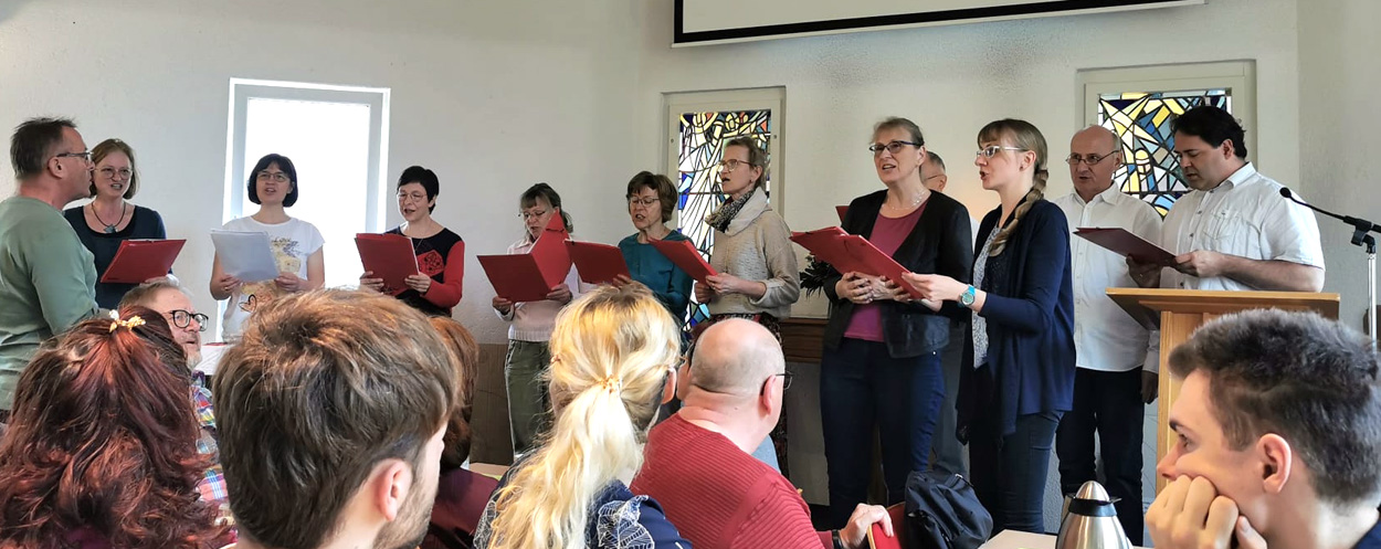 Ca 12 Männer und Frauen singen gemeinsam in unserem Chor. Zum Üben treffen wir uns meist montags im Bethlehemraum, zwei- bis dreimal im Monat. Wir gestalten Gemeinschaftsstunden in verschiedenen Orten aus, üben für die größeren Veranstaltungen, wie den jährlichen Saitenspielgottesdienst in Kamenz , für Ostern, den Gartentag in Bretnig, den Bezirksgemeinschaftstag, das Sommerfest und für Weihnachten. Neue Sängerinnen und Sänger sind herzlich willkommen!