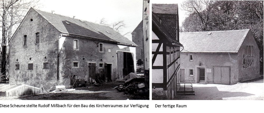Das war völlig ungewöhnlich, dass ein Kirchenbau zu DDR-Zeiten verwirklicht werden konnte. Die Familie Mißbach stellte ihre Scheune (siehe Bilder) dazu zur Verfügung. Mit viel Einfallsreichtum, viel Eigenleistungen und Spenden haben die Friedersdorfer innerhalb eines Jahres den Kirchen- und Gemeinschaftssaal gebaut, den „Bethlehemraum“.